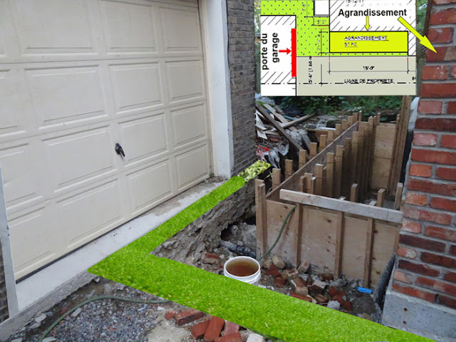 Selon les plans approuvés par l’arrondissement (voir le médaillon), en élargissant de près de quatre pieds la résidence, une voiture n’a plus la place nécessaire pour entrer dans le garage. On a aussi prévu que plus de la moitié de l’espace devant la porte du garage sera végétalisé. Bref, on condamne doublement un espace de stationnement en dépit de l’article 9.1.1 du règlement 1177 qui l’interdit spécifiquement.